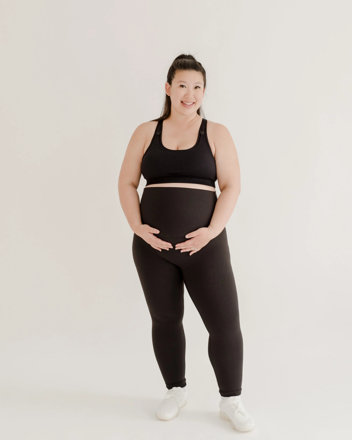 A delicate scrunch and V-seam detail at the back enhances your natural shape, while the soft yet supportive belly band provides a subtle lift without ever feeling restrictive. Finished in our signature, buttery-soft fabric — sourced over nearly a year — this legging wraps you in skin-to-skin softness, long before baby arrives.