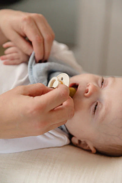 Sterilize each pacifier before use. Bring water to a boil and pour boiling water over pacifiers. Let the pacifiers soak for approx. 5 minutes. Pick them up and let them dry. The pacifier nipples may retain water, simply squeeze the nipple to release and lay to cool and dry for 3-4 hours. If the pacifier shows any irregularities, we recommend that you discard right away. Due to our pacifiers being made with natural rubber, the nipple may expand with use.