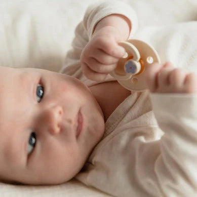 Sterilize each pacifier before use. Bring water to a boil and pour boiling water over pacifiers. Let the pacifiers soak for approx. 5 minutes. Pick them up and let them dry. The pacifier nipples may retain water, simply squeeze the nipple to release and lay to cool and dry for 3-4 hours. If the pacifier shows any irregularities, we recommend that you discard right away. Due to our pacifiers being made with natural rubber, the nipple may expand with use.