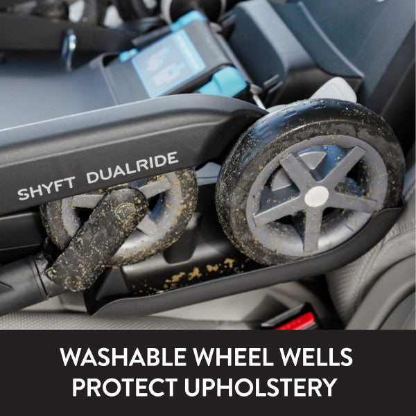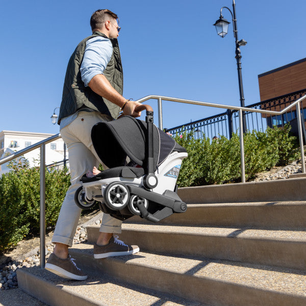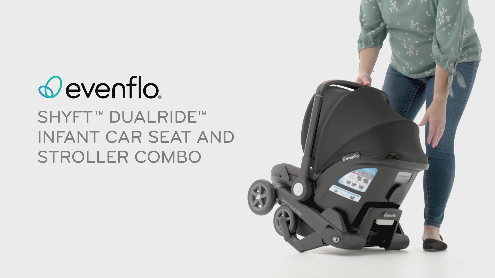 Shyft into life with a newborn! The Evenflo® Gold Shyft™ DualRide™ with Carryall Storage Infant Car Seat and Stroller Combo is a single piece of baby gear that Shyfts from infant car seat to stroller in one step, streamlining life on the go. Moving from car to sidewalk? Simply lift the carrier off the base, release the wheels and you’re rolling in no time. From backseat to street in a heartbeat! Maneuvering stairs? Retract the wheels, carry up/down steps, pop the wheels back down and stroll on. No struggling with multiple pieces of gear. No disturbing your little one. This car seat stroller combo makes every trip easier. While researching the best car seats for your little one, consider this: DualRide’s anti-rebound base absorbs and dissipates crash forces to provide additional stability and give you peace of mind, so you can make the Shyft with confidence. Designed for infants as small as 3 lb and up to 35 lb, who measure from 15.7 in. to 32 in., this infant car seat and stroller in one comes with a no-rethread harness that adjusts to 8 positions to grow with your child. Thoughtful design places the infant carrier on the stroller higher, so your baby’s sweet face is always near. You’re looking for a safe infant car seat — and the smart car seat is a connected car seat. With SensorSafe™ to connect you to your little one from the backseat, the DualRide is the gold standard when it comes to child car seat safety. In car seat mode, DualRide’s integrated SensorSafe technology alerts you in real-time to 4 potentially unsafe conditions from your child’s car seat via Bluetooth: unexpected chest clip unbuckling, temperature too hot or too cold in the car, child unattended in the car, and child seated too long. LockStrongTM Installation and Quick Connectors provide solid, secure installation in no time. This stroller car seat combo provides an extendable, full-coverage canopy to block rain and snow, with UPF 50+ to help protect against the sun — a built-in mesh peek-a-boo panel lets you keep an eye on your baby. With the DualRide stroller and car seat combo, the extras aren’t extra! A removable carryall storage bag and removable parent cupholder are included. Another plus: Wheels nest securely in the base wheel wells in your vehicle, so you can take just the carrier into your home without tracking in dirt. To finish it off, Evenflo Gold’s DualRide features our most sophisticated silhouette and premium details, including vegan leather trim, chrome zippers and pulls, plus washable padding, to ensure you make the Shyft to new parenthood in style. Shyft into action, effortlessly! At Evenflo, we go above and beyond government standards to create car seats that are safe. The Evenflo Gold Shyft DualRide meets or exceeds all applicable federal safety standards. It is structural integrity tested at energy levels approximately 2x the federal crash test standard, and it is side-impact tested, rollover tested and temperature tested. If you need help installing your car seat, our ParentLink® customer service experts offer help online in real time. Get live video support with a certified car seat safety technician to assist with proper vehicle installation, so you can drive with confidence. It's been 100 years and Evenflo continues to push the boundaries in baby and children’s gear design and innovation. We meet the needs of new generations of parents by focusing on what they really care about: leading-edge safety, smart design and technology, and convenient features that help them enjoy the journey of parenthood.