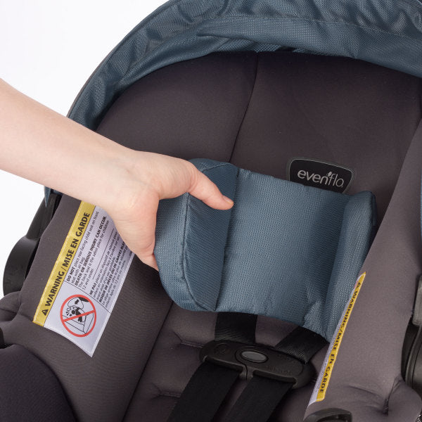 The ultimate crossover stroller; the Evenflo® Folio3™ Stroll & Jog Travel System is the best of both worlds. Fully-featured and lightweight for everyday strolls; with the added benefit of large, air-filled tires and a lockable front wheel for all-terrain jogging. The unique, in-seat fold is more compact than than most full-size strollers, and self-stands so you never have to bend over to put it in your vehicle. An oversized storage basket, parent and child consoles and a full-coverage canopy with peek-a-boo window come in handy for shopping and trips to the park, while the pneumatic tires, front-wheel swivel lock and adjustable handle give you the performance you need when jogging! When you arrive at your destination, the LiteMax™ 35 Infant Car Seat moves from base to stroller with one secure click. Rollover tested and side impact tested, this infant seat is a top safety pick. The integrated belt lock-off system, multi-position base and recline indicator offer peace of mind that the base is securely and correctly installed. Lightweight, with an ergonomically-designed handle, this seat can be comfortably carried in the bend of the arm. Other “must-haves” include a full-coverage canopy, up-front harness adjust and a plush infant head pillow.