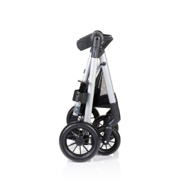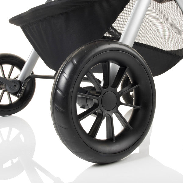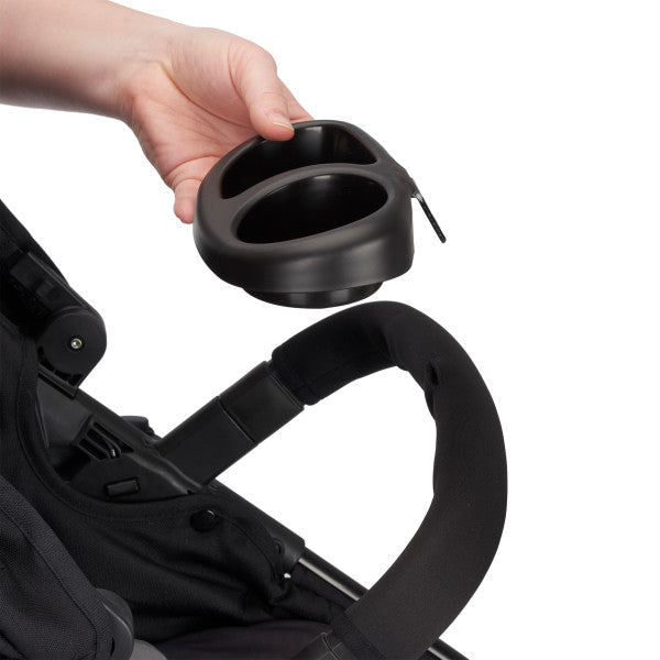 The feature-rich stroller includes cruiser tires to make it easy to navigate over multiple surfaces, a large canopy with a peek-a-boo window, an over-sized storage basket, removable arm bar with cup holder and snack tray, and convenient self-standing fold.