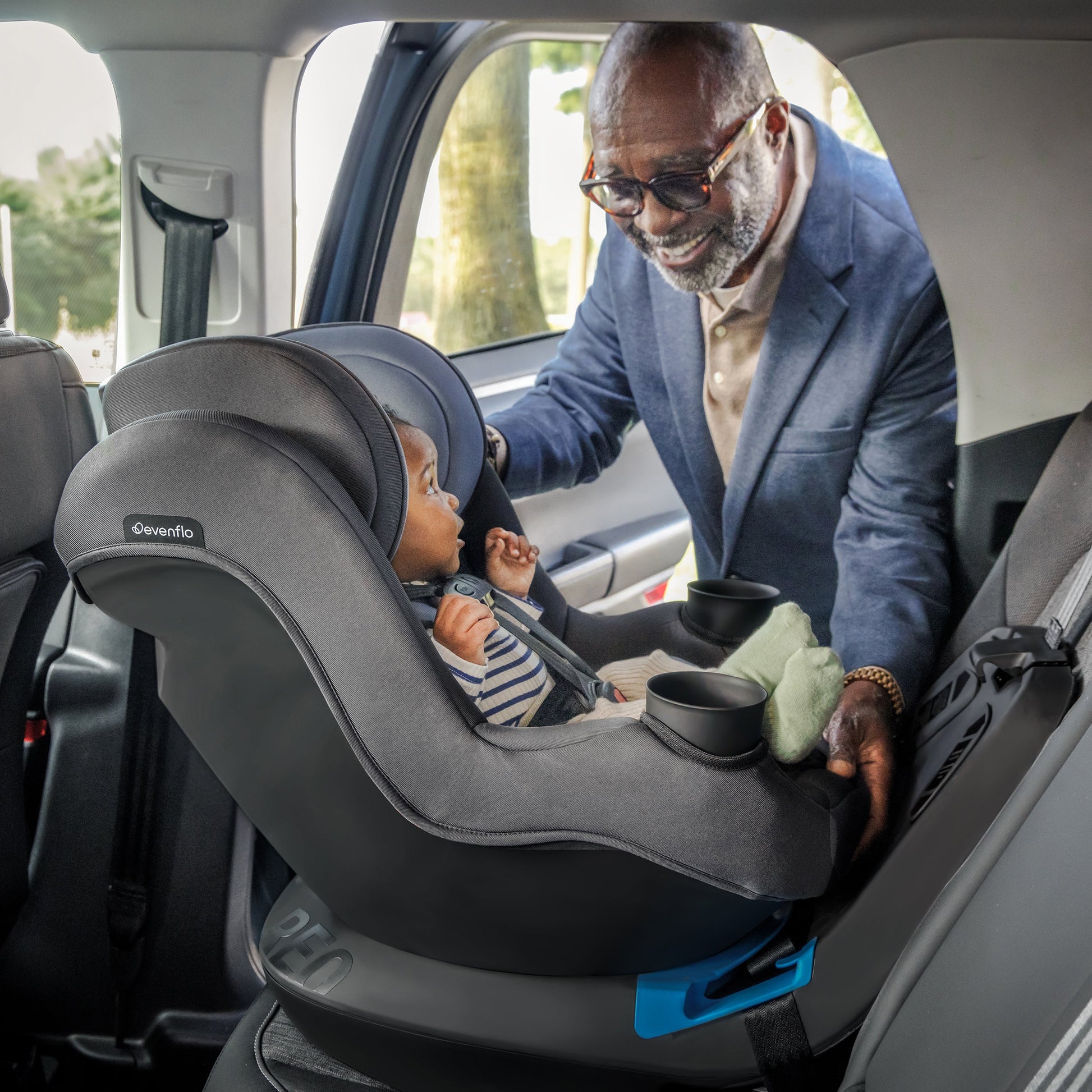 New parent jitters? Not your first rodeo? About to be a grandparent? Need a second seat? Whatever brings your search for a safe, easy-to-use car seat to Evenflo® ’s REO™ by Revolve360™ Rotational Convertible Car Seat, you’ve come to the right place! For practicality and real ease, there’s nothing better than one-hand, 360° rotation — no kidding. Shortens your reach. Helps to save your back. Simplifies getting your child in and out of the car. Secure, one-and-done LATCH installation with hassle-free hooks makes things easy from the outset. Then, when your little one is ready for forward-facing, just rotate — no uninstalling. The compact 17 in. wide footprint makes space for passengers without sacrificing your child’s safety or comfort. REO provides rear-facing mode for children 4 lb to 40 lb (17 in. to 43 in. tall) with optimal infant fit, and forward-facing mode for children from 30 lb to 40 lb (35 in. to 43 in. tall). An excellent and compact choice for grandparents, caregivers and secondary vehicles. 11-position headrest easily adjusts with one hand while the no-rethread harness adjusts in one step for comfort and security as your child grows. Includes 2 removable, dishwasher-safe cup holders.