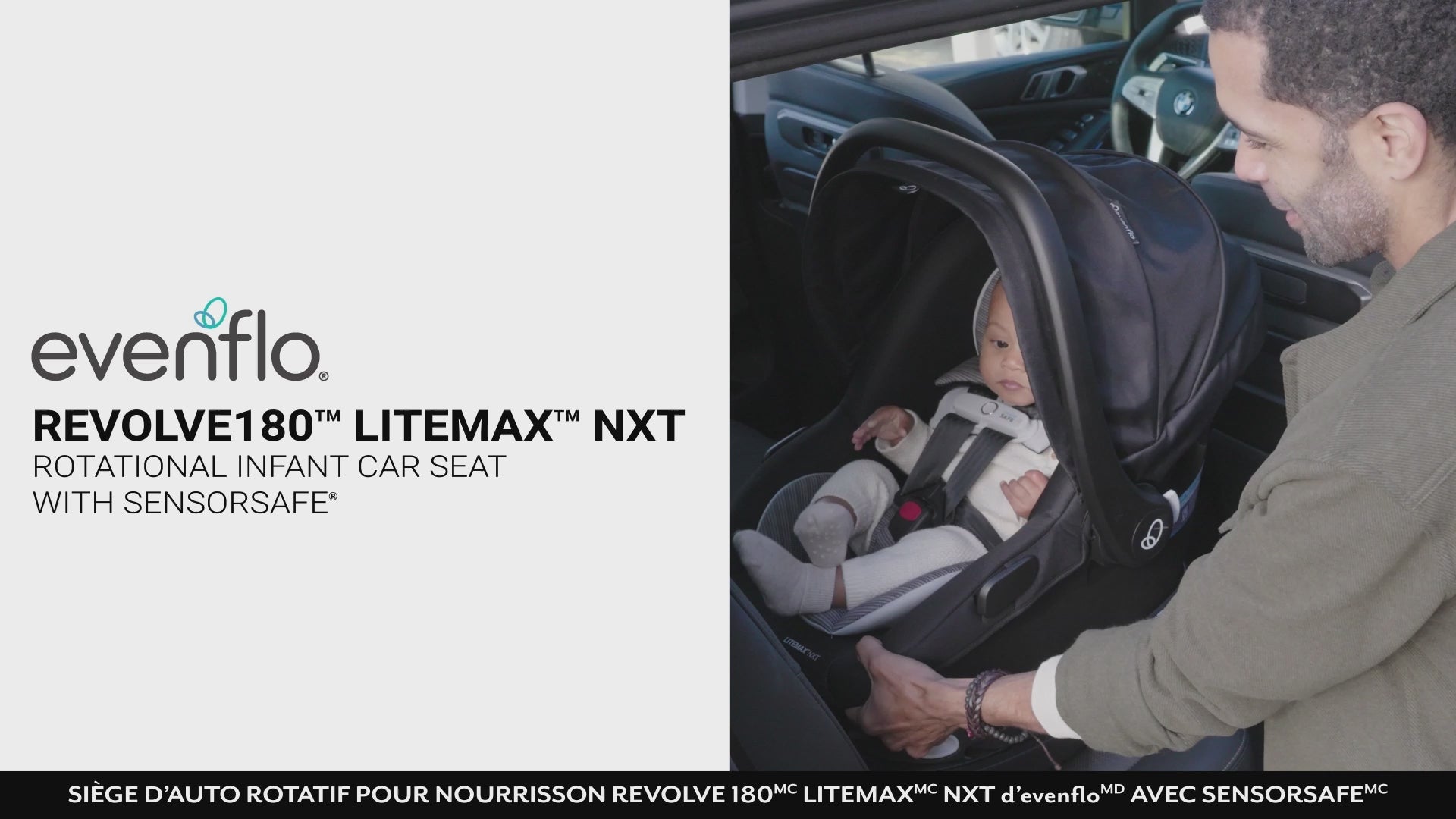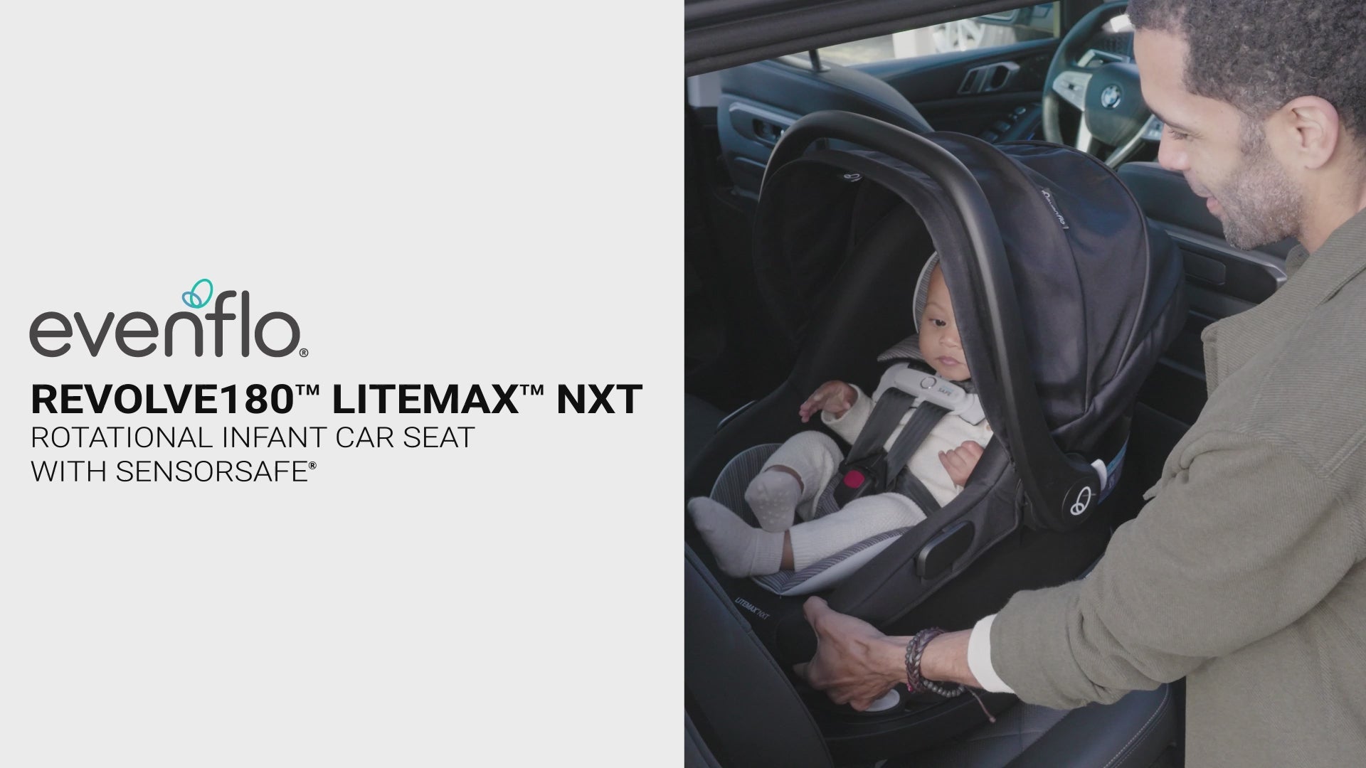 NXT-level convenience on the go with your little one begins with the Evenflo® Revolve180TM LiteMaxTM NXT Rotational Infant Car Seat with SensorSafe®. For infants weighing from 3 to 22 lb (15.7 in. to 29 in. tall), this infant car seat’s one-hand, 180° rotation is a game-changer. This allows you to turn your child toward you to simplify loading and unloading — especially handy when backseat space is tight. Integrated SensorSafe technology adds a layer of protection for peace of mind, alerting you in real-time to 4 potentially unsafe conditions from your child’s car seat via Bluetooth® wireless technology: unsafe ambient temperature, child unattended, child buckled too long, and unexpected chest clip unbuckling. LockStrongTM belt tensioning system provides solid, secure installation in no time. Revolve180 LiteMax NXT is compatible with adjustable SafeZoneTM Load Leg accessory (sold separately), which helps to stabilize the seat base by limiting rotation and reducing crash forces. GREENGUARD® Gold Certified for meeting low chemical emissions standards to create a healthier environment for your child.
