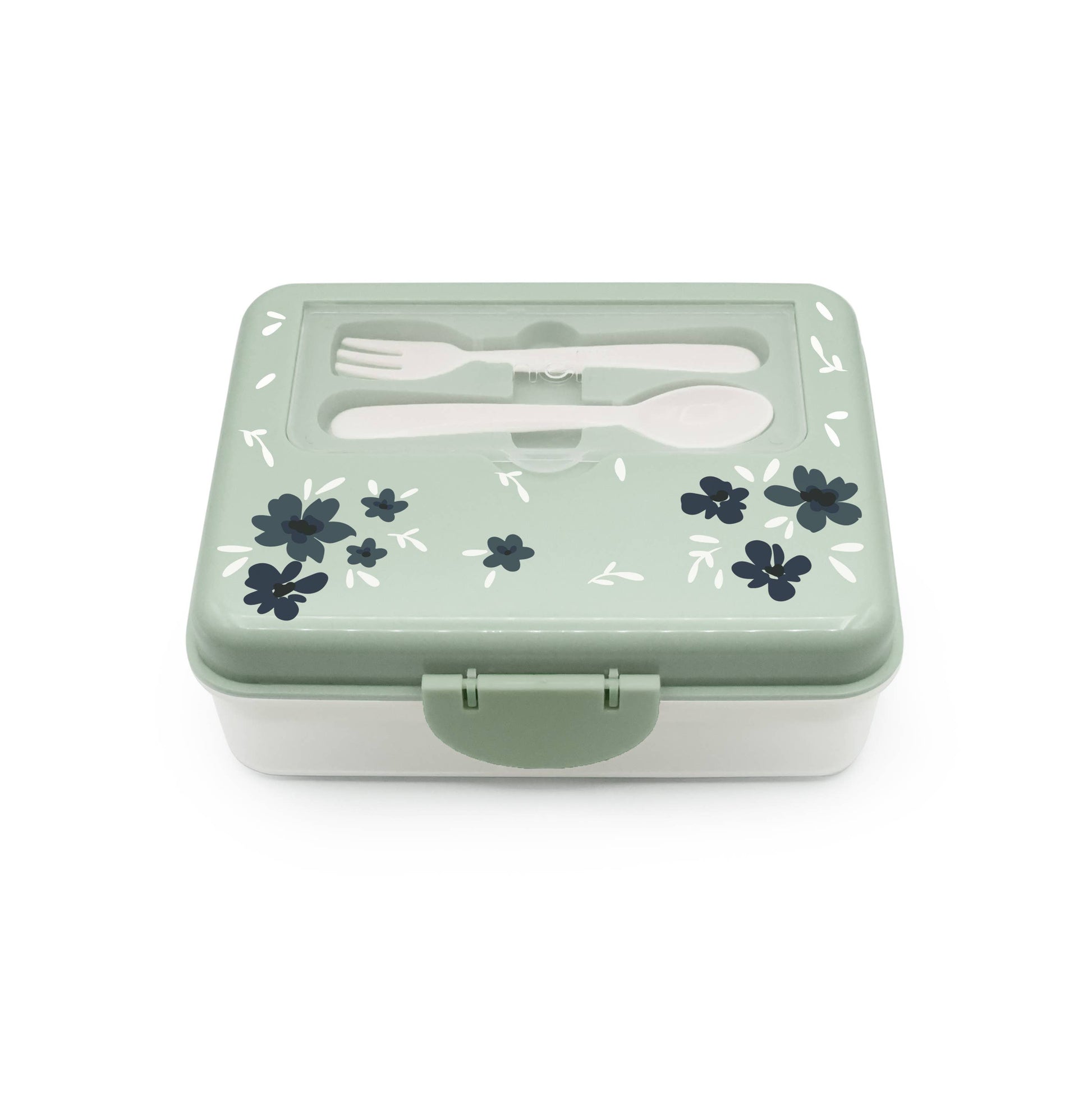 Comes with matching integrated spoon and fork, with a separate compartment in the lid.