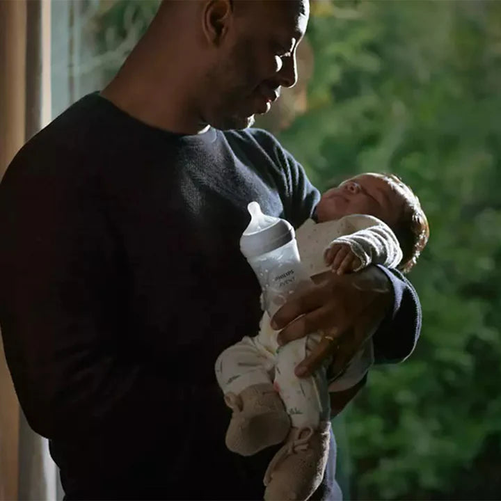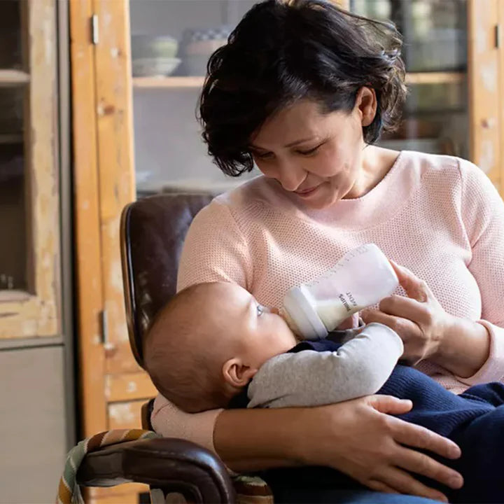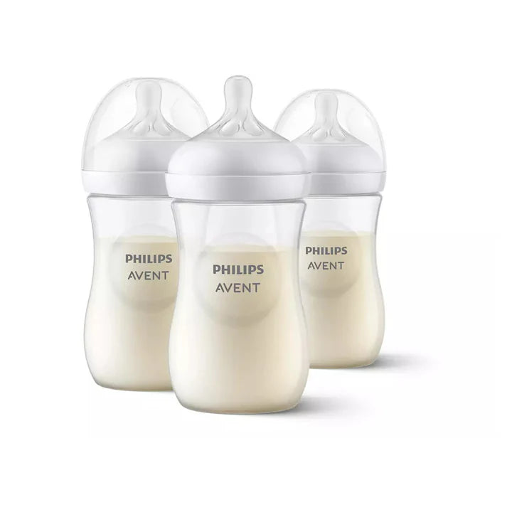 Philips Avent Natural bottle with the Natural Response nipple lets baby control the pace of the milk, like they do when breastfeeding. The nipple's unique opening and tip only releases milk when your baby actively drinks. When pausing to swallow and breathe, no milk flows. Baby can drink, swallow, and breathe using their natural rhythm, just like they do when breastfeeding. Easily combine breast and bottle feeding with a wide, breast-shaped nipple that has a soft feel, mimicking the shape and feel of a breast; plus, baby controls the flow of milk like they do when breastfeeding. The nipple has a no-drip design, which helps prevent lost milk from the tip. An anti-colic valve integrated into the nipple is designed to reduce colic and discomfort by sending air away from your baby's tummy. The ergonomic shape makes it comfortable for parents to hold and easy for small fingers to grasp. Assembly is simple with only a few parts, and the wide bottle neck makes filling and cleaning easy. The Natural bottle is made from polypropylene, a BPA-free material, and works with all nipples and caps from the Natural line. The Natural response nipples come in flow rates 1-5 to keep up with your baby's growth.