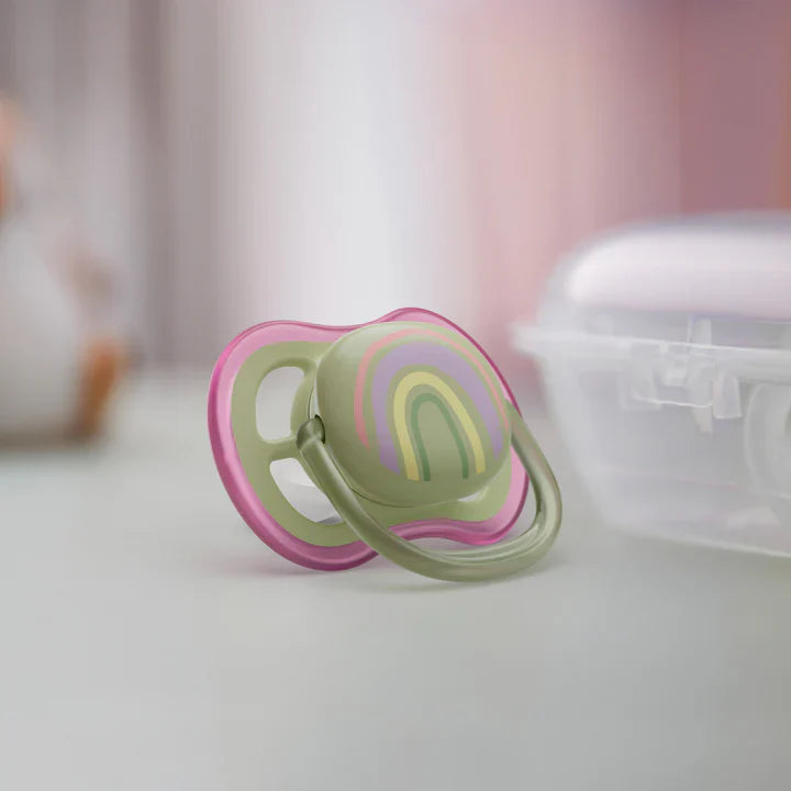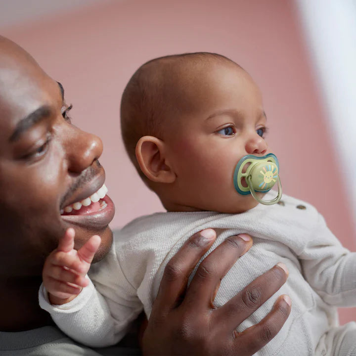 The Philips Avent Ultra Air Pacifier is a breathable pacifier designed for babies aged 0-6 months. It features extra-large air holes that allow your baby's skin to breathe, keeping it dry and comfortable. This orthodontic and BPA-free pacifier set includes a travel case that doubles as a sterilizer - just add water and pop it in the microwave, so you can rest easy knowing it's clean for the next use. When we asked moms how their little ones respond to our textured silicone nipples, on average 98%* said that their baby accepts Philips Avent Ultra Soft and Ultra Air pacifiers. Everything about the Ultra Air Pacifier is designed for comfort, including the silky nipple, making it easy for your baby to latch on and get accustomed quickly. We also focus on your baby's healthy oral development with a symmetrical nipple that respects the natural shape of their palate, teeth, and gums. - *2016-2017 US consumer tests show an average of 98% nipple acceptance of the textured Philips Avent nipple used in our Ultra Air and Ultra Soft soothers.