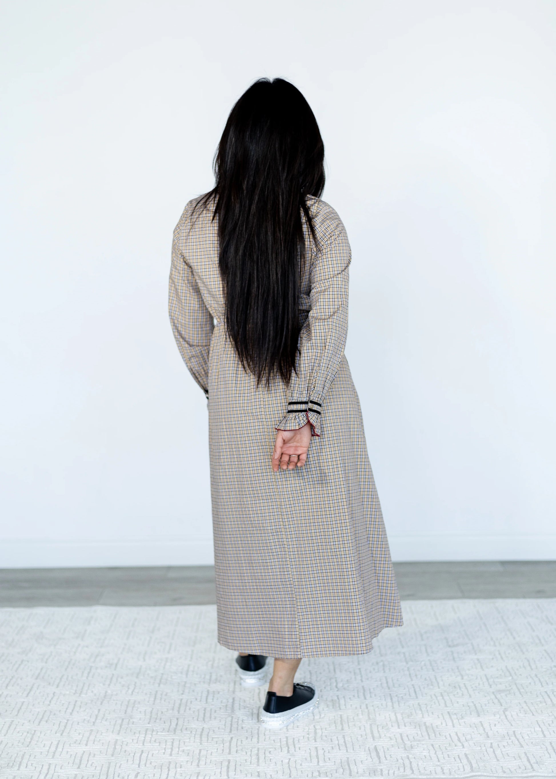 The classic mockneck midi dress with a Victorian twist: black velvet piping around the neck and cuffs, topped with maroon red ruffle outline. We made her with 100% cotton because we know you love your natural fibres. With an all-over plaid pattern and slightly puffed sleeves that finish off with gold buttons, this long-sleeved neutral dress is here to stay: it's all in the details.